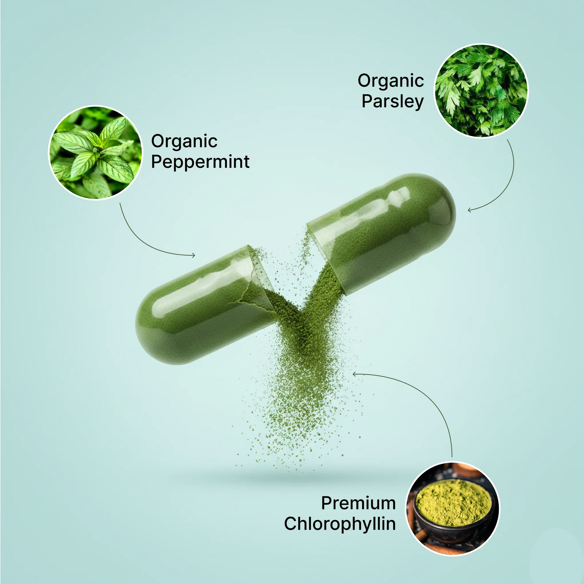Fresher works systemically through your digestive system. When you digest protein, your body produces sulfur compounds and ammonia that are released through your breath. Fresher's active ingredient—chlorophyllin copper complex—binds to these odor-causing compounds and neutralizes them before they can be exhaled. It also helps reduce volatile sulfur compounds from postnasal drip that coat your tongue. One daily capsule addresses the internal source that mouthwash and gum can't reach.